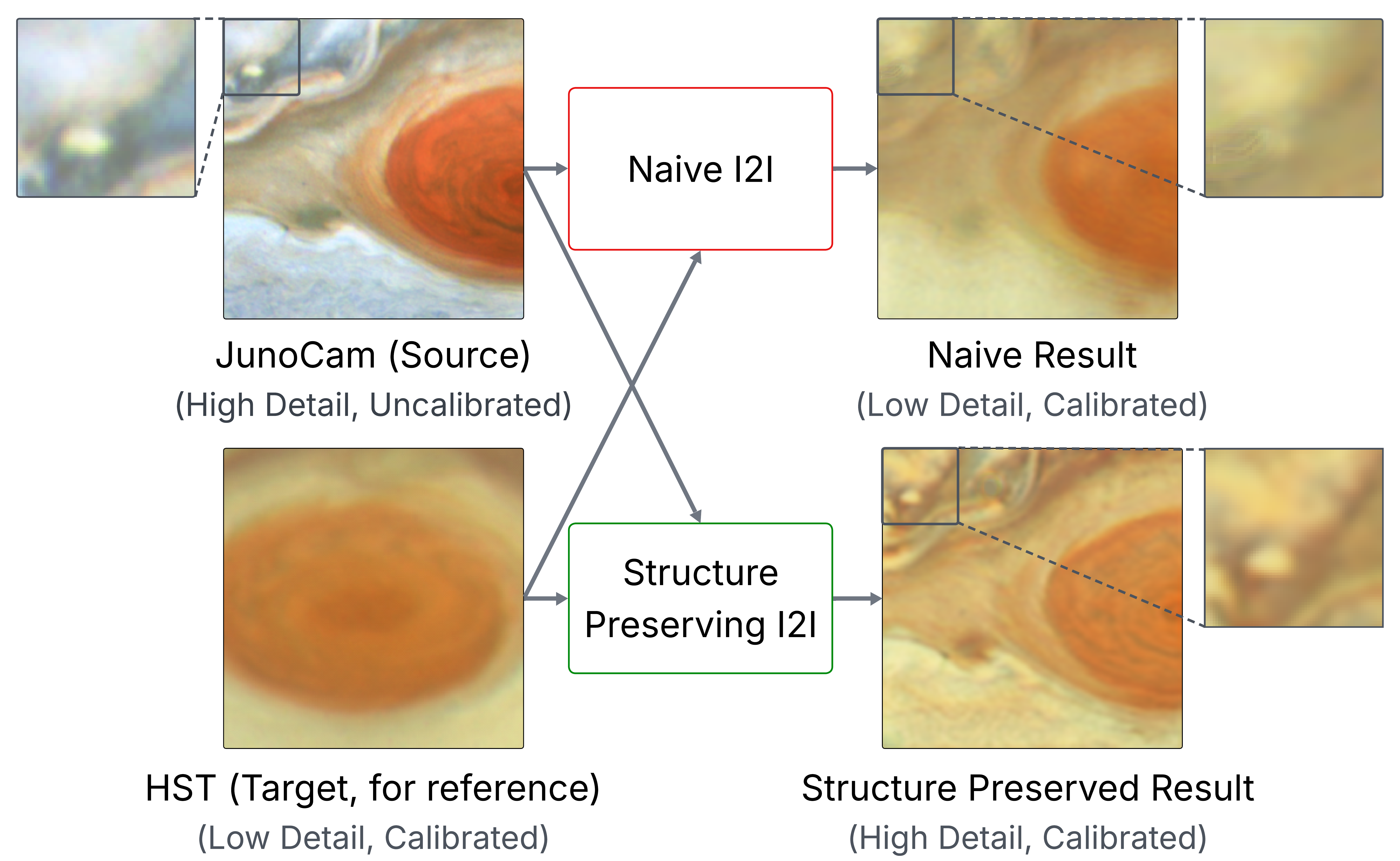 Structure-Preserving Unpaired Image Translation to Photometrically Calibrate JunoCam with Hubble Data